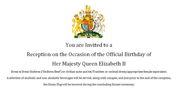 Letzte Woche hatte ich eine weitere Einladung zu einem offiziellen Empfang - eine Britische Cocktail Party zu Ehren des Geburtstages von HM Queen Elizabeth II. Wir haben sogar ein offizielles Dankesschreiben aus dem Buckingham Palast erhalten!